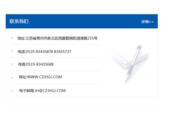 傳真:0519-83435688    郵編:213135    網址:WWW.czjhgj_com.bethelsz.com    電子郵箱:JH@czjhgj_com.bethelsz.com